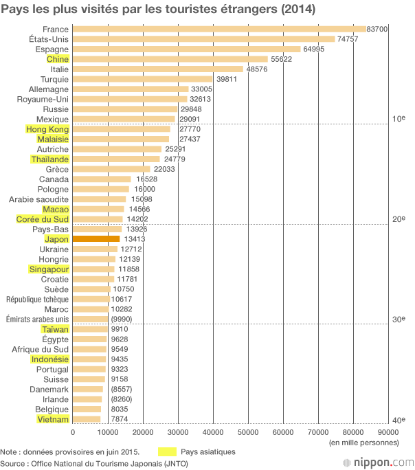 De ce fait, le Japon devrait progresser dans le classement des pays les plus visités par les touristes étrangers. Alors qu’il se situait à la 22e place en 2014 (à la 27e en 2013), ses 19,74 millions de visiteurs étrangers en 2015 devraient le faire monter aux environs de la 15e place. L’objectif du gouvernement de 20 millions de visiteurs en 2020 avant les Jeux olympiques et paralympiques de Tokyo, a de fait été atteint beaucoup plus tôt que prévu.