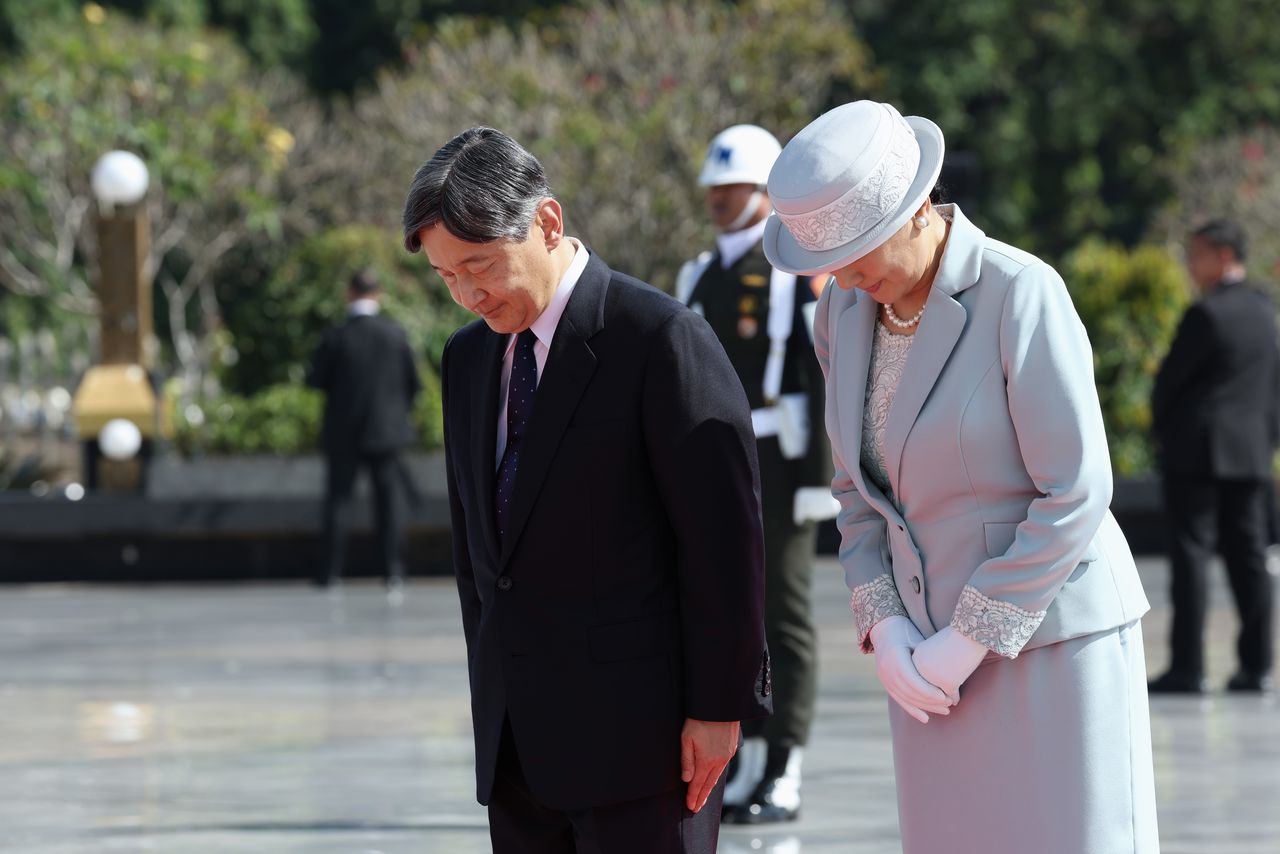 L’empereur Naruhito et l’impératrice Masako se recueillent au Cimetière national des héros, à Jakarta, en Indonésie, en juin 2023. (© Jiji)