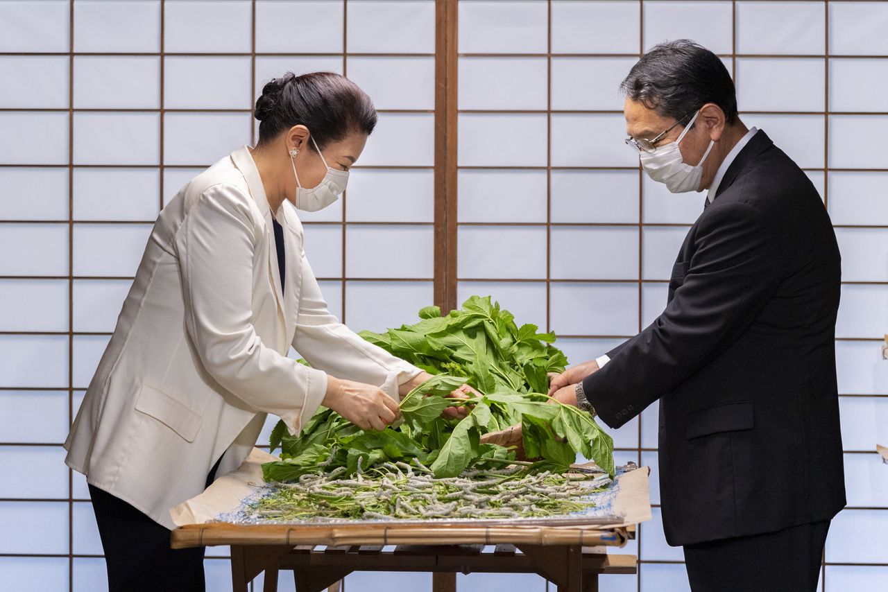 Depuis 1872, les impératrices japonaises élèvent des vers à soie. Du printemps jusqu’au début de l’été, elle accomplit les tâches liées à l’élevage des vers à soie et à la récolte de leurs cocons. Les vers à soie d’aujourd’hui sont l’espèce la plus proche de ceux élevés dans l’Antiquité, et leur soie est utilisée pour recréer des œuvres textiles classiques dans le trésor Shōsōin du temple Tōdai-ji à Nara.