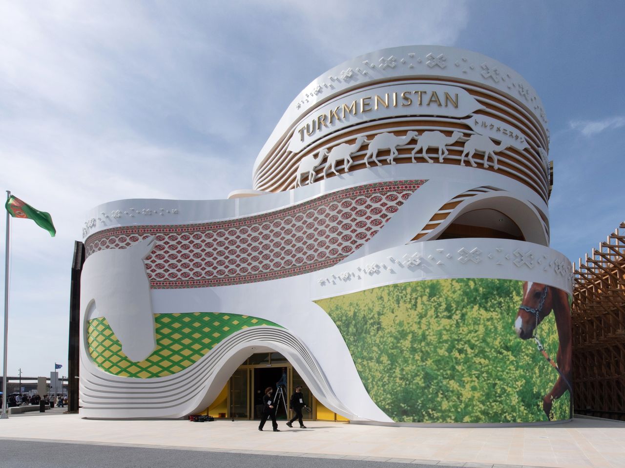 Le pavillon évoque des scènes du désert de Karakum, qui occupe près de 70 % du territoire du pays. Sa forme en triangle arrondi exprime les idées de « circulation », de « durabilité » et de « flux de vie ». L’écran géant situé sur le mur extérieur montre des images de personnes vivant en harmonie avec la nature, ainsi que des scènes de chevaux en liberté.