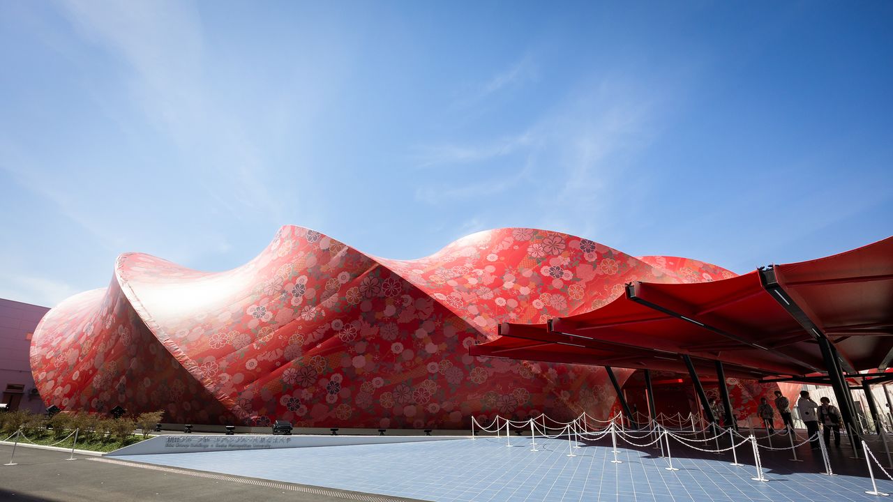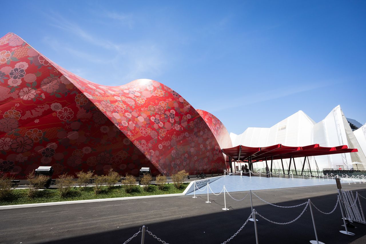 Le pavillon est drapé du fameux tissu de soie de Kyoto, le Nishijin-ori, spécialement traité avec des technologies modernes, représentant ainsi la fusion entre l’avenir et la tradition.