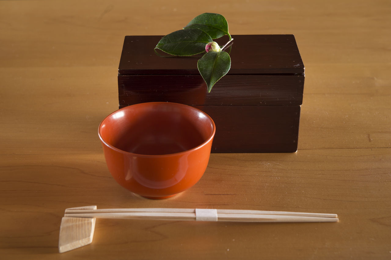 Nature morte du petit déjeuner : baguettes, bol et boîte à repas bentô laqués, bourgeon de camélia