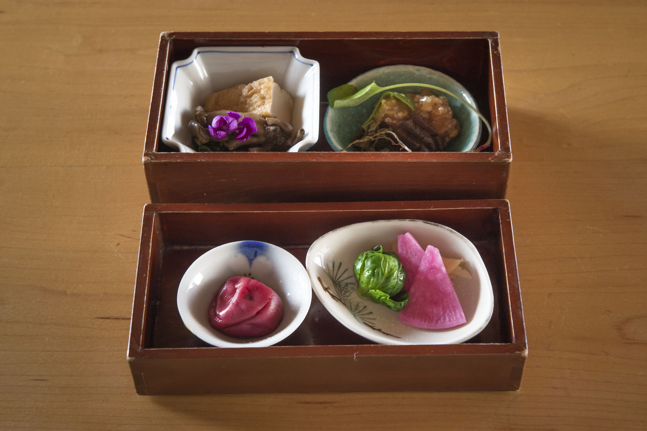 Mais ils ne se nourrissaient bien sûr pas seulement de gruau de riz. Ils savaient mettre les petits plats dans les grands lors d’occasions spéciales, comme les festivals ou les rencontres locales de sumo. Villageois et citadins préparaient des boîtes à repas remplies de plats festifs, l’occasion de profiter d’une journée placée sous le signe de la convivialité et du divertissement tout en y apportant une touche de gaieté à leur repas. Et avec le chef Nakatani, cette tradition se retrouve chaque matin dans chaque boîte individuelle de bentô livrée à ses convives, en plus du chagayu. Soulevez délicatement le couvercle laqué et là, spectacle garanti pour les yeux ; tout un assortiment de plats et de condiments préparés avec amour, mettant à l’honneur des ingrédients locaux de choix. D’apparence extrêmement sobre, un brin austère, le petit-déjeuner de l’auberge Yanaseya révèle au contraire à chaque bouchée toute sa richesse et sa finesse. La quintessence de la cuisine de Nara.