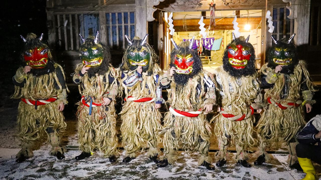 Durant la nuit du 31 décembre, des démons appelés namahage rôdent dans la péninsule d’Oga, dans la préfecture d’Akita. Ils font irruption dans les maisons, tapant des pieds toujours chaussés pour faire du bruit, et brandissant d’effrayants grands couteaux. Ils s’écrient « Y a-t-il des enfants pleurnichards ici ? » et se mettent à courir derrière ces petits qui hurlent de terreur, et les prennent dans leurs bras.