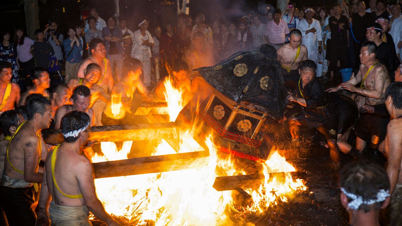 (Les dates données sont les dates habituelles de ces festivals. Photo de titre : le mikoshi en feu du festival Ushitsu Abare. © Haga Library)