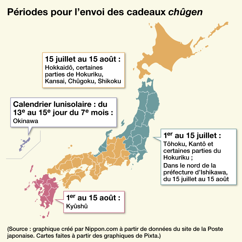 Il est de coutume au Japon d’exprimer sa gratitude en offrant, à la mi-été (chûgen) et en fin d’année (seibo), des présents à la famille, aux proches et aux personnes envers qui l’on a une dette de reconnaissance. Les entreprises établissent souvent une liste de leurs clients et envoient des cadeaux en masse, ce qui peut surprendre les non-Japonais lorsqu’un présent arrive soudainement à leur porte ! Cette pratique trouve son origine dans les offrandes de fruits ou de saké destinées aux ancêtres.