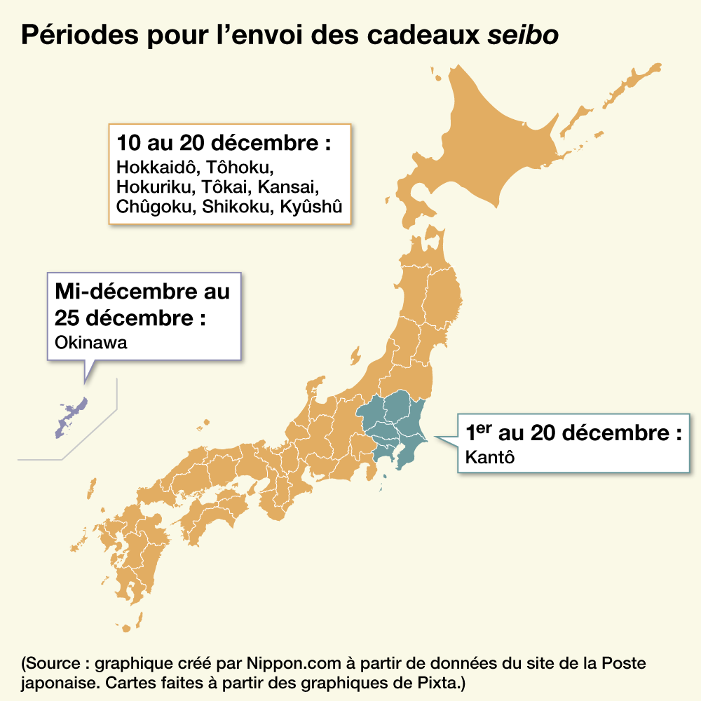 Les périodes d’envoi des cadeaux chûgen varient considérablement selon les régions, et si possible, il convient de les expédier pendant la période appropriée. Les cadeaux seibo sont généralement envoyés jusqu’à la mi-décembre, lorsque commencent les préparatifs du Nouvel An, mais de nos jours, ils sont envoyés de plus en plus tôt chaque année. Une exception existe pour les aliments frais destinés à être consommés au Nouvel An : ceux-ci peuvent être envoyés fin décembre, mais dans ce cas, il est préférable de vérifier au préalable si le destinataire risque d’être absent pendant les fêtes.