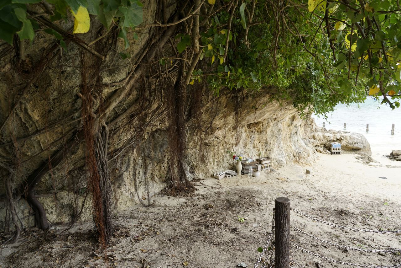 Avant même la construction du Naminoue-gû, le promontoire était déjà un lieu de culte. Quand on s’en approche en marchant sur la plage, au pied de la falaise, on constate que les vagues ont travaillé le roc au fil des siècles. Au premier coup d’œil, on ne voit qu’une masse rocheuse abrupte et austère, mais à y regarder de plus près, on croit y distinguer un autel et le paysage se fait plus solennel. Les habitants des Ryûkyû croyaient jadis que les dieux qui vivaient à Nirai Kanai, une légendaire contrée située au-delà des mers, pouvaient leur apporter fertilité, bonheur et longue vie. L’extrémité du rocher géant qu’on pensait en connexion avec Nirai Kanai était un lieu de culte révéré sous le nom de « Ryûgû » (qui signifie « palais du dragon »). De nos jours encore, les femmes viennent se recueillir sur le site et prier pour le développement de la région, la sécurité de leur foyer ou la santé de leurs proches.