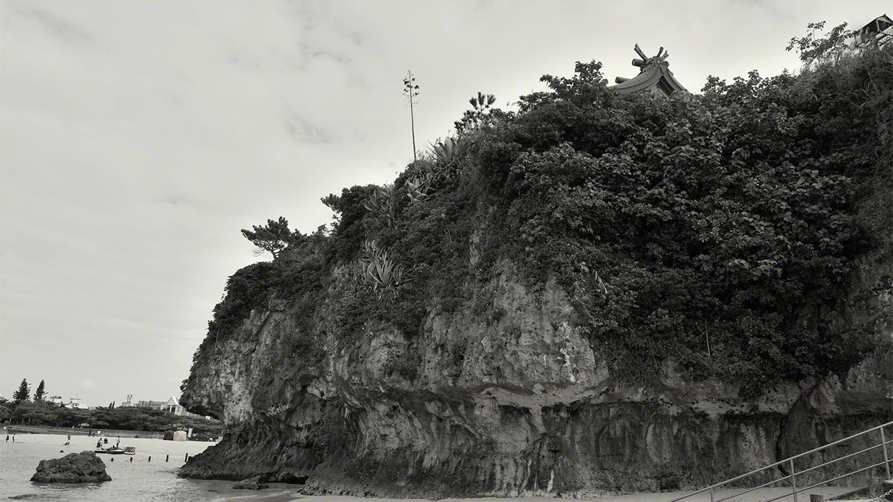 De nos jours, le pont appelé Naminoue-bashi qui enjambe la baie passe tout près de la falaise. Appuyé sur la balustrade, on peut contempler l’énorme rocher dominant les flots azur et le sanctuaire qui le surmonte a tout d’un donjon de château médiéval. Appelé « Hana-gusuku » à l’époque du royaume des Ryûkyû, l’imposant rocher faisant face à la mer symbolisait la grandeur du royaume, c’était le plus grand des lieux saints d’où prier Nirai Kanai.