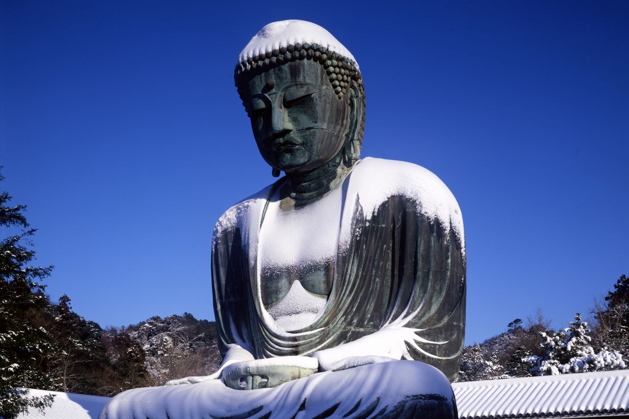 On a l’impression que la statue change d’aspect selon le temps. Les images avec un ciel bleu limpide sont les plus courantes, mais le Grand Bouddha prend un air de splendeur solitaire sous la pluie. Bien qu’il soit rare qu’il neige à Kamakura, un manteau de blanc lui donne un aspect plus solennel.