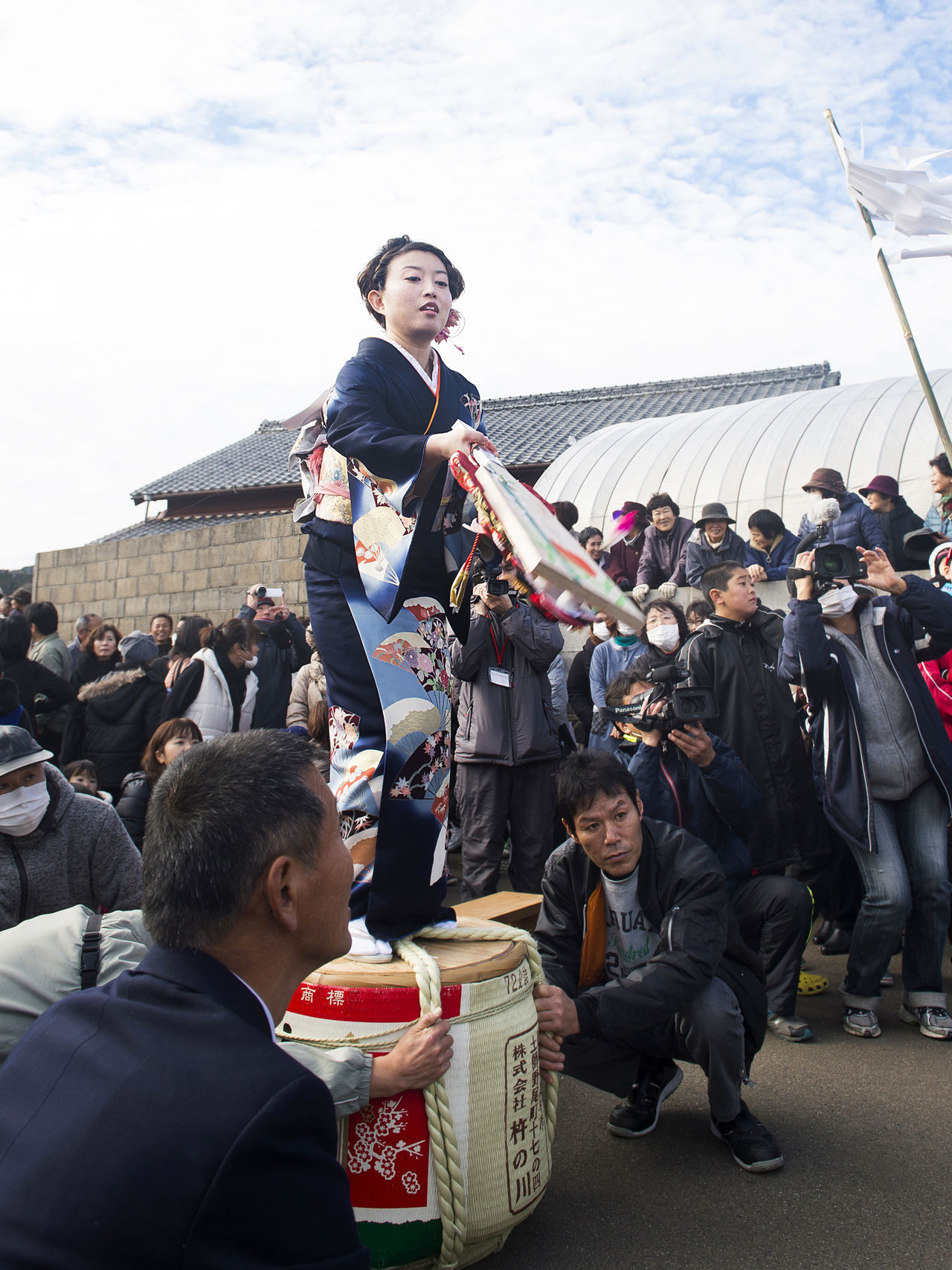 Une femme se perche sur un tonneau de saké pour jouer avec sa batte en bois. De nombreuses scènes bizarres comme celle-ci sont visibles pendant le Hetomato.