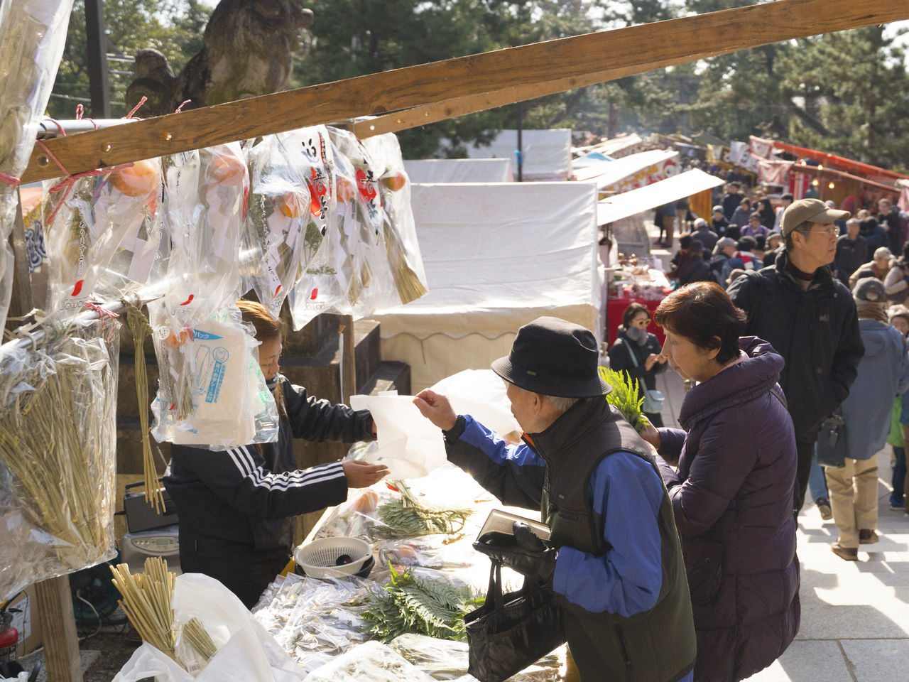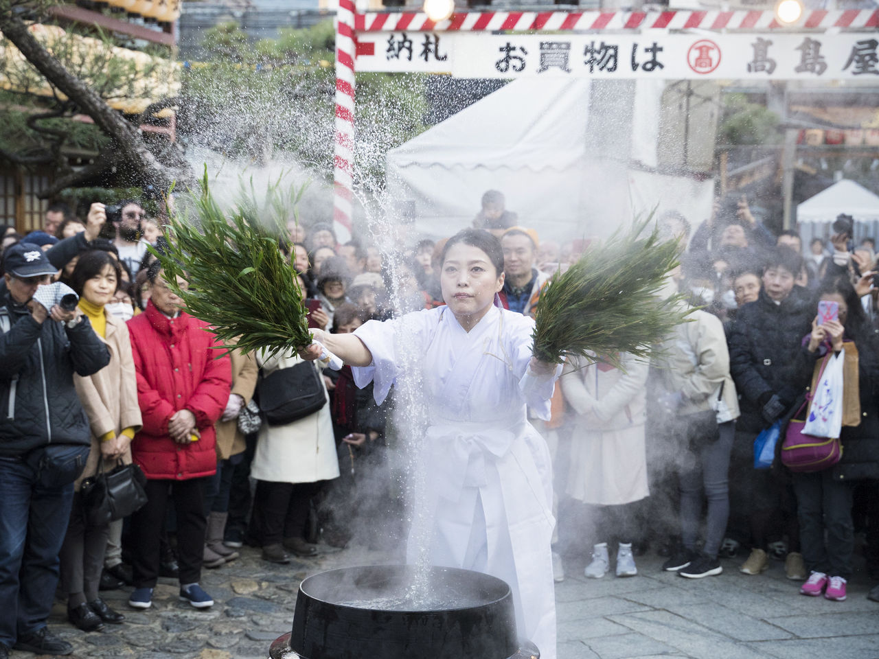 L’offrande de feuilles de bambou pour demander prospérité à la maison et dans les affaires est la principale cérémonie organisée à cette période, mais on voit également des acteurs des studios Tôei de Kyoto arriver en chaise à porteurs traditionnelle pour une prière, et c’est également ici que la fédération des pêcheurs de Kyoto vient faire offrande d’un thon. Les nombreux étals aux abords du sanctuaire sont fréquentés par une foule de fidèles venus prier pour une année prospère.