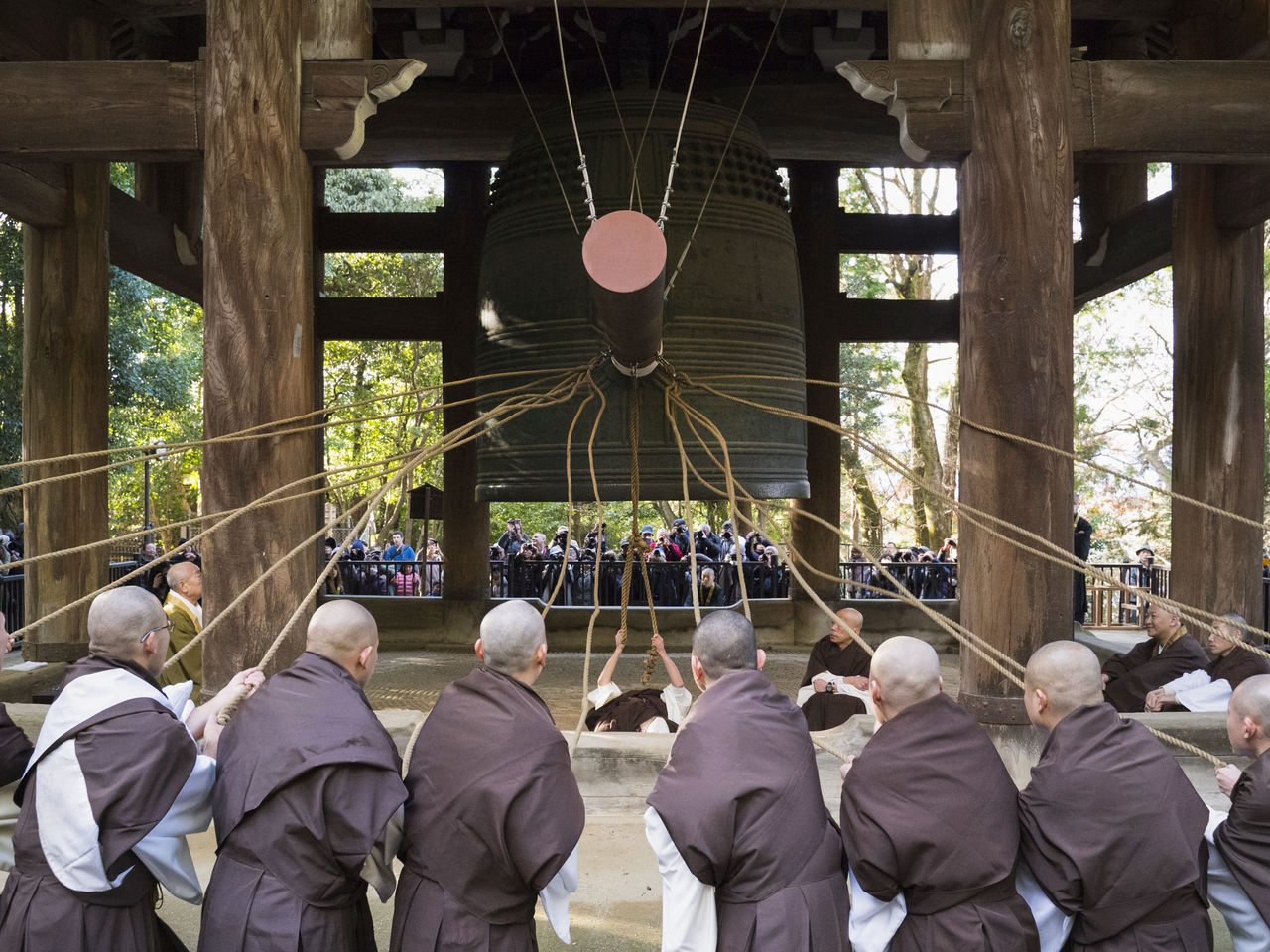 Au Chion-in (arrondissement de Higashiyama), temple principal de l’école bouddhique Jôdo-shû (école de la Terre pure), la cloche que viendront frapper 108 fois les fidèles pour fêter le passage à la nouvelle année est testée le 27 décembre. L’imposante cloche du temple, l’une des plus grosses du Japon, est désignée patrimoine national important. Avec ses 3,3 mètres de haut et un diamètre d’environ 2,8 mètres, elle pèse autour de 70 tonnes, ce qui en fait l’une des trois plus grandes cloches de temples du pays, aux côtés de celles du Tôdai-ji et du Hôkô-ji.