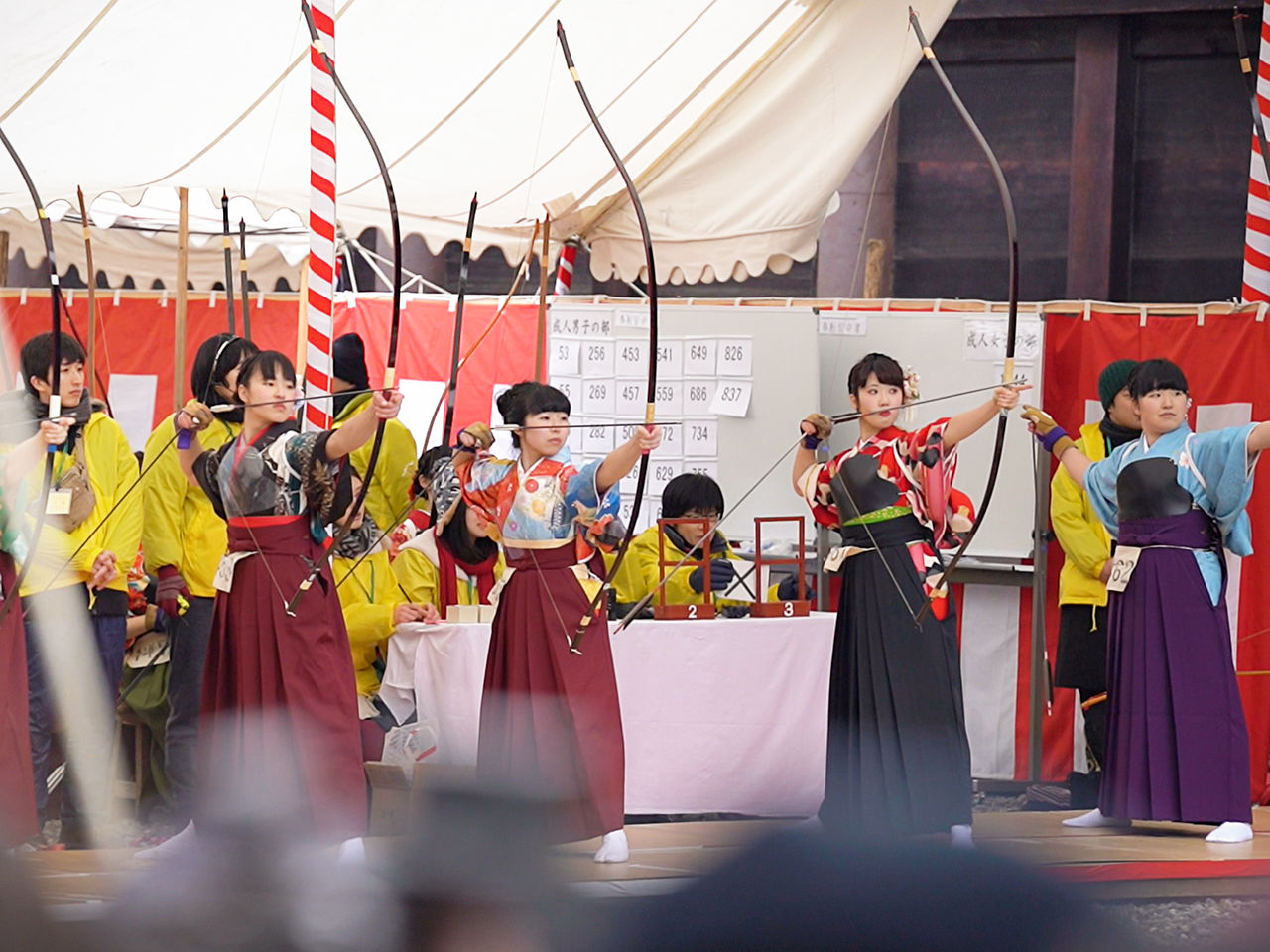 C’est ainsi que le dimanche le plus proche du 15 janvier, quelque 2 000 participants, parmi lesquels les meilleurs tireurs à l’arc du pays et des jeunes gens fêtant leurs vingt ans (année du passage à l’âge adulte) se rassemblent pour un tournoi de tir à l’arc baptisé ômato. Ils doivent atteindre une cible d’environ un mètre de diamètre située à une soixantaine de mètres de distance. Cette cérémonie magnifique au cours de laquelle des jeunes gens en kimono pratiquent le tir à l’arc japonais est réputée dans tout l’archipel.