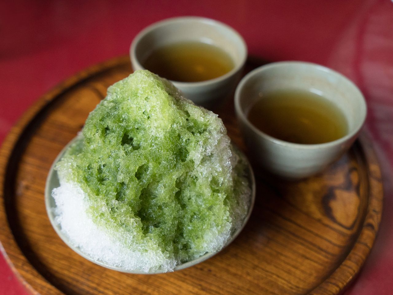 La « glace rasée akafuku » (akafuku-gôri). La pâte de haricot, spécialement fabriquée pour l’occasion, et les mochi sont inclus dans ce dessert, sur lequel est appliqué du sirop de matcha.