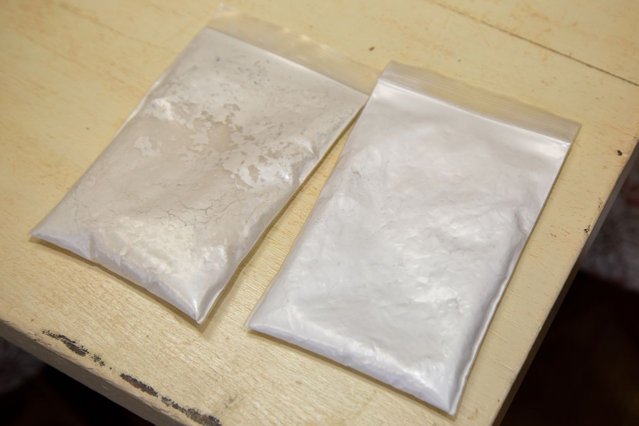 À droite, la séricite extraite par Sanshin Mining. Elle est beaucoup plus blanche que celle produite par un concurrent (à gauche). Son grain est également plus fin.