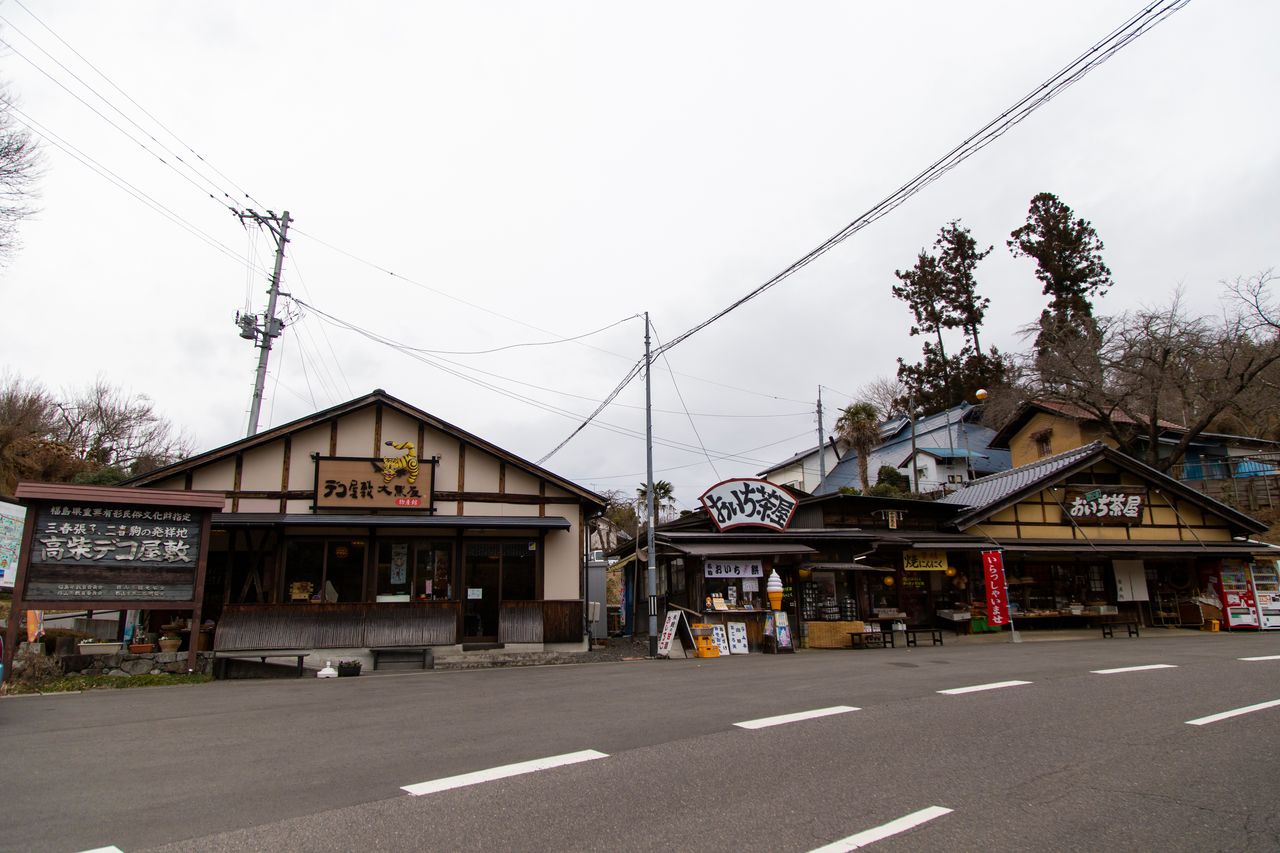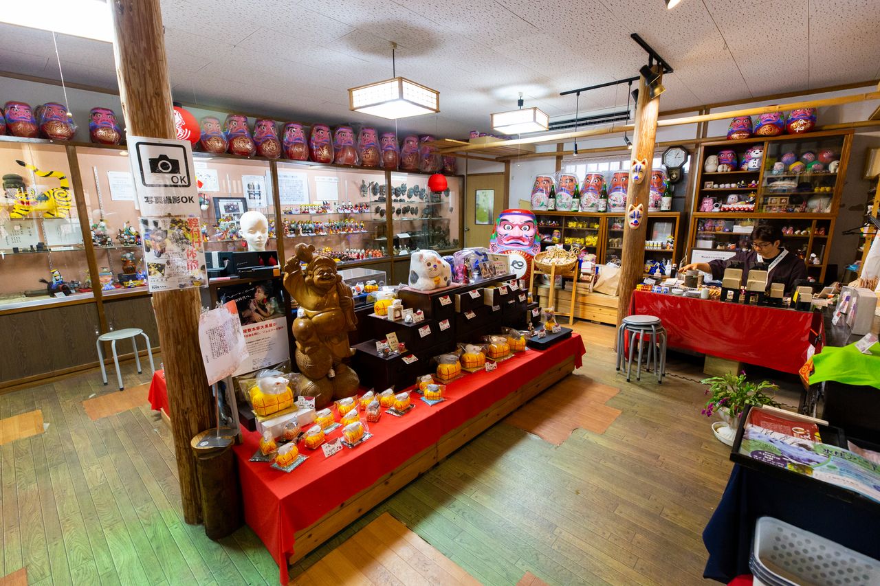 À gauche, une boutique où sont vendues les figurines hariko (Daikokuya Bussankan). À droite, une aire de restauration.