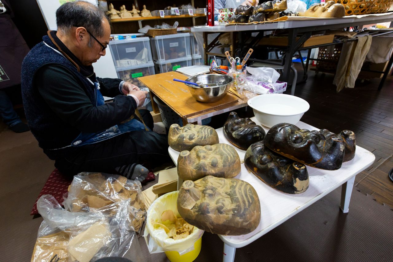 Les pièces de bois qui sont utilisées comme moule pour donner leurs formes à toutes ces créations, que ce soient les figurines classique d’animaux, les daruma aux formes généreuses ou encore les masques, sont transmises de génération en génération dans chaque atelier du groupe Takashiba Deko Yashiki.