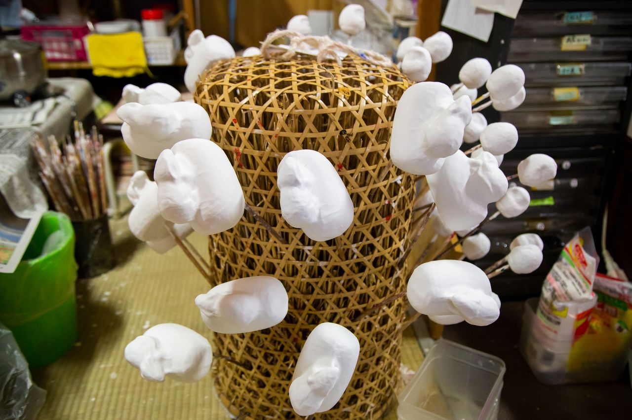 Les formes ainsi obtenues sont enduites de gofun, une poudre blanche naturelle fabriquée à base de coquillages concassés. Ici, les représentations du Rat, l’un des signes du zodiaque. Disposées sur un panier de bambou en forme de balle de riz, elles n’ont plus qu’à sécher.