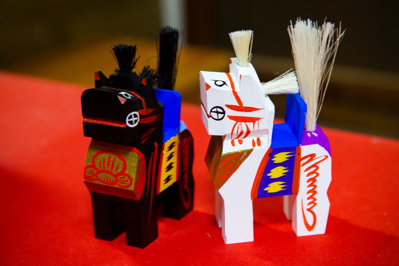 Parmi les célèbres créations hariko de l’atelier de Hashimoto Shôichi, citons les Miharu-goma, des pièces de bois de couleur noire ou blanche en forme de cheval. Le cheval noir symbolise le désir d’avoir des enfants et/ou de prier pour leur bonne santé, tandis que le cheval blanc symbolise la longévité.