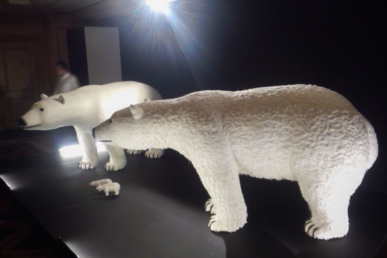 La figurine hariko représentant un ours polaire, exposée lors du Take Action Charity Gala 2011. Les fibres du papier washi ont été effilées pour donner une apparence plus vraie que nature à la fourrure de l’animal (photo avec l’aimable autorisation de Hashimoto Shôichi).