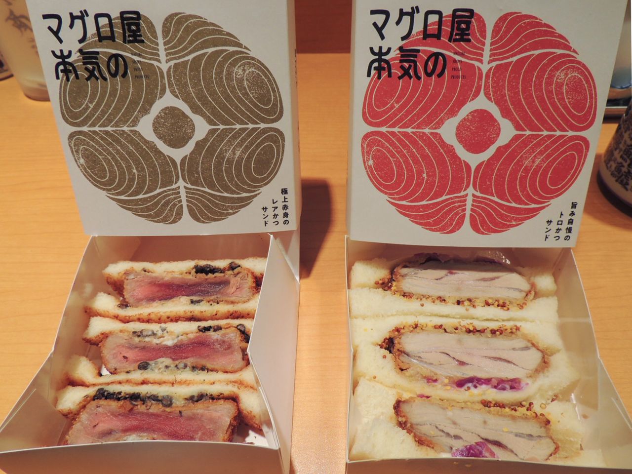 (À gauche) Sandwichs garnis de tranches panées de thon rouge (akami) saignant. (À droite) Sandwichs garnis de tranches panées de toro, le morceau le plus recherché, le plus fondant et le plus coûteux du thon rouge. (© Kawamoto Daigo)