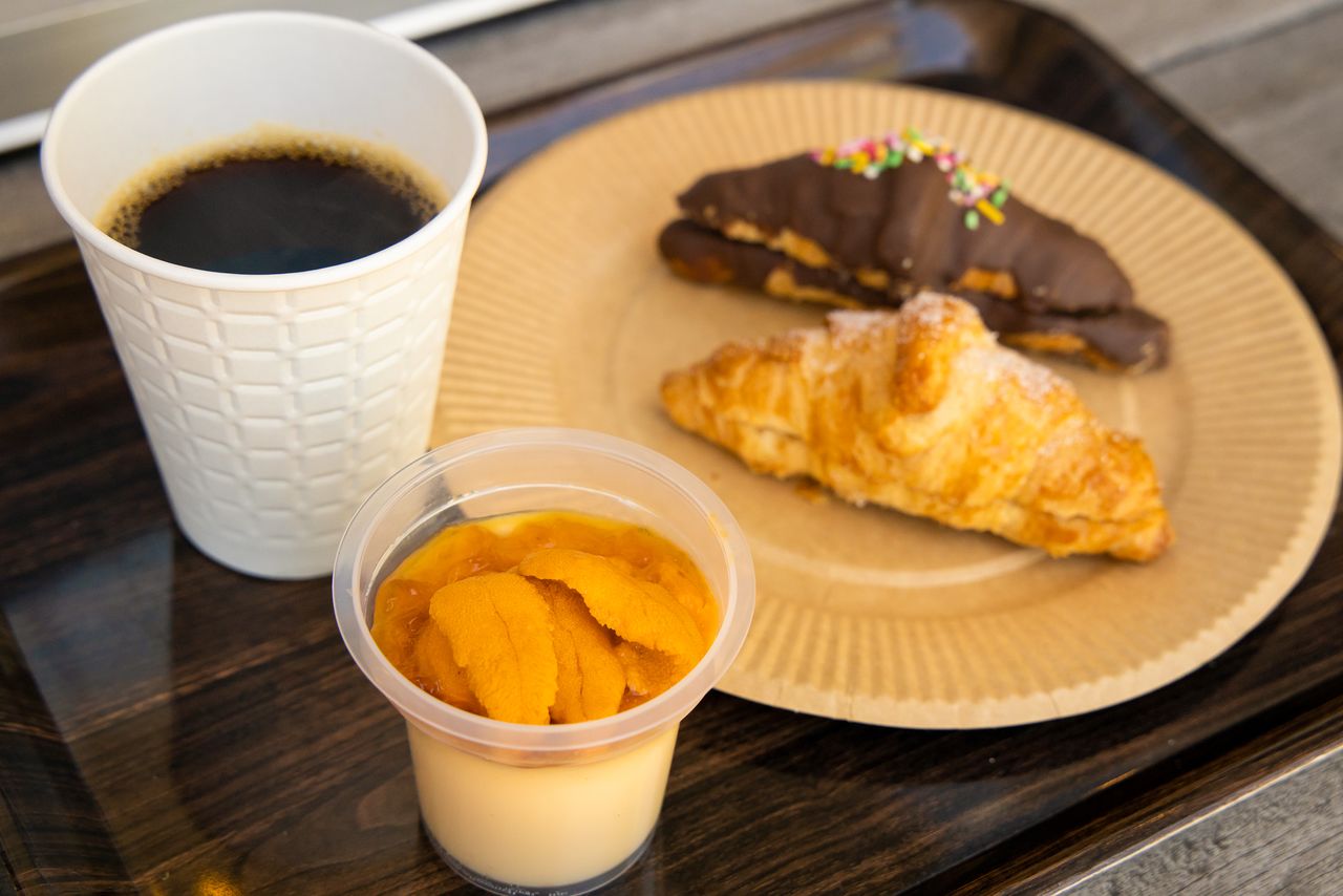 Un flan au corail d’oursin (uni), aussi délicieux qu’audacieux. Ce dessert de luxe, qui se marie parfaitement avec un café, est une création du restaurant Senriken, situé au deuxième étage de la partie extérieure du marché de Tsukiji.