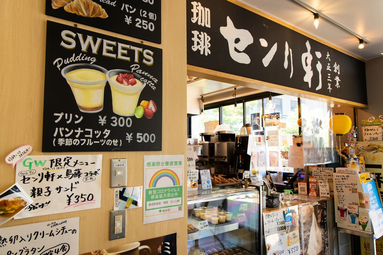 Le Senriken de Tsukiji est particulièrement réputé pour ses flans (purin). On y trouve aussi des plats totalement innovants qui n’ont fait qu’accroitre sa popularité. En particulier, un velouté de tronçons de turbo cornu (sazae) servi dans sa coquille pour 1 680 yens (13 euros) et une pizza aux alevins de sardines (shirasu) pour 800 yens (6 euros).