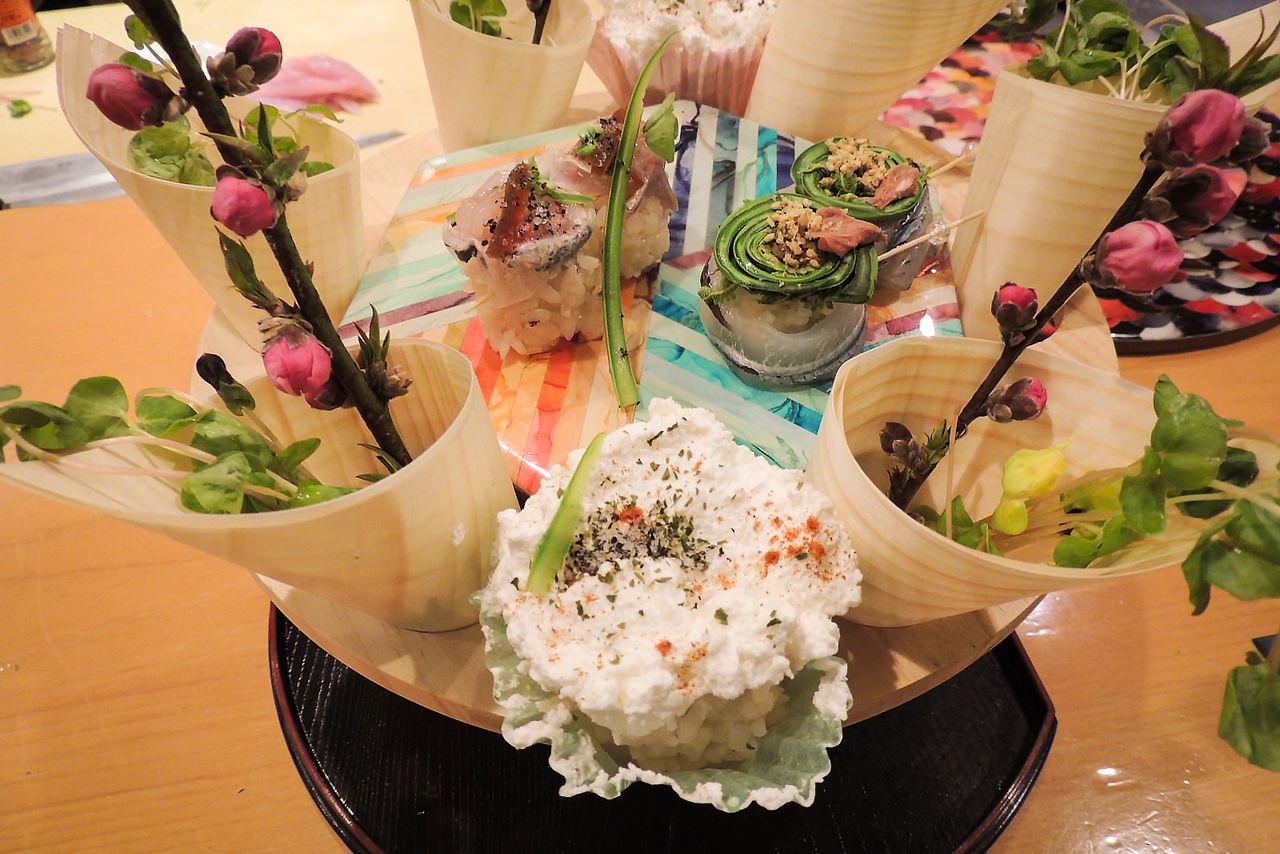 Deux entremets innovants aussi élégants qu’appétissants, tels qu’on peut les déguster dans le restaurant Nadeshiko Sushi de Tokyo. Cet établissement est malheureusement fermé pour le moment en raison de l’état d’urgence sanitaire décrété par le gouvernement japonais.