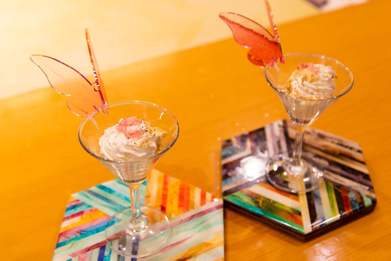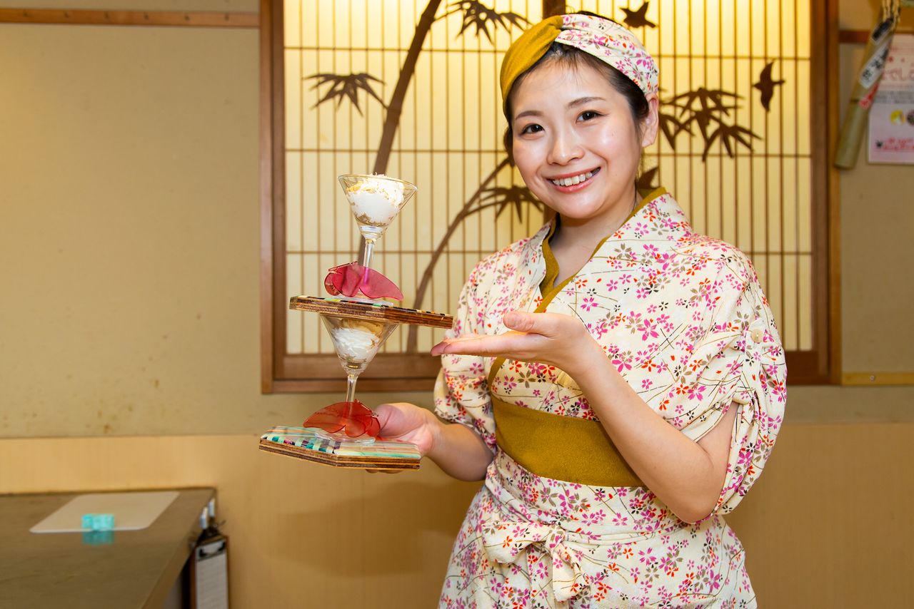 (Photos de Nippon.com, sauf indication contraire. Photo de titre : Chizui Yuki, patronne du restaurant Nadeshiko Sushi de Tokyo, avec une coupe de dessert à la daurade rose)