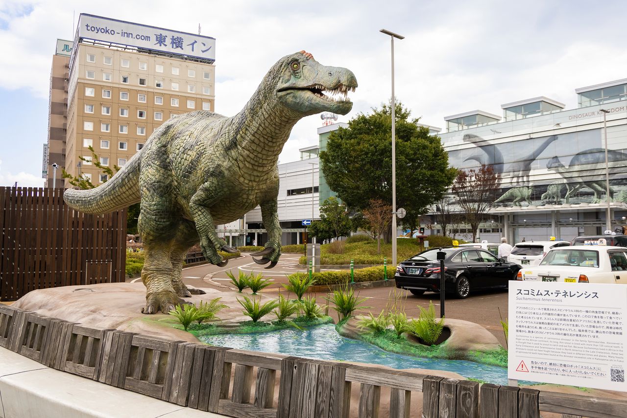 Une statue mobile du Suchomimus tenerensis devant la gare de Fukui