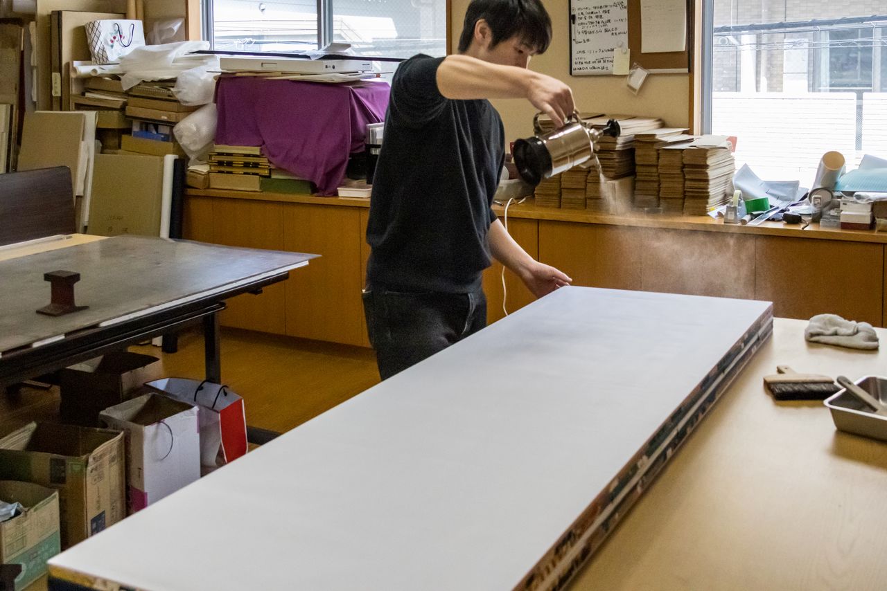 L’un des artisans de Kataoka Byôbu utilise une technique traditionnelle pour lisser la surface du paravent avant l’application des motifs.
