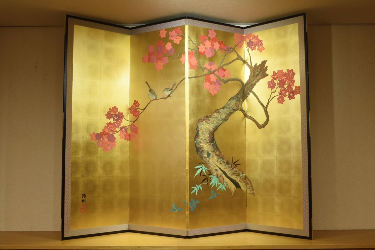 Un paravent commandé par un client étranger, avec un érable japonais sur fond doré. (Avec l’aimable autorisation de Kataokoa Byôbu)