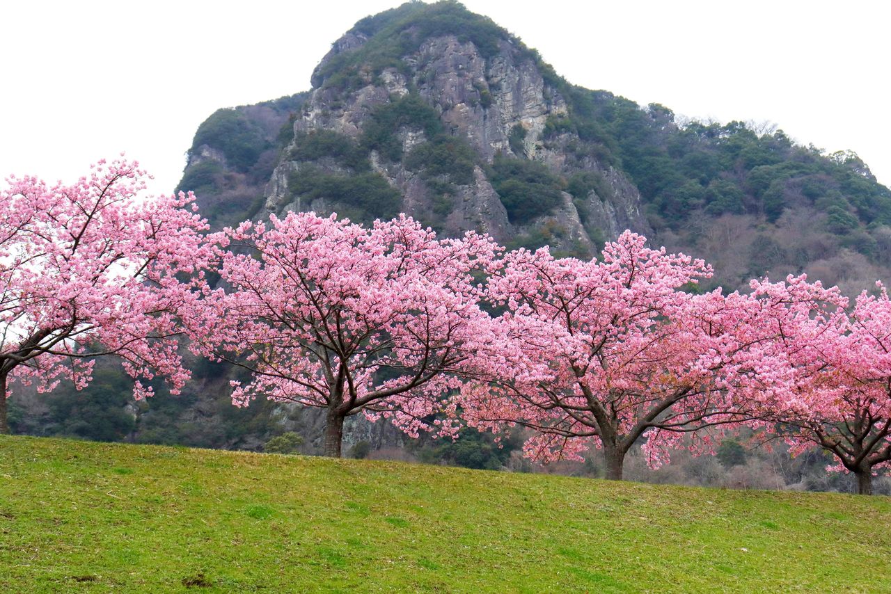 Quelque 800 cerisiers précoces kawazu-zakura bordent sur deux kilomètres la rivière Aono, dans la ville de Minami-Izu ; leur floraison intervient environ un mois avant celle de la variété la plus répandue au Japon, le somei-yoshino. Associées aux fleurs de colza (nanohana) qui s’épanouissent dans les champs voisins, elles composent un paysage vivifiant, propice au ressourcement.