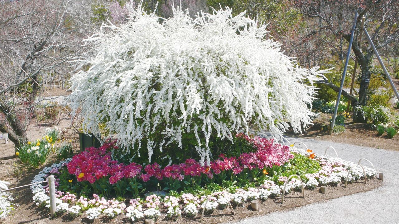 Au parc floral d’Ashikaga, il y a toujours des fleurs, quelle que soit la saison. Lorsque les 30 000 tulipes multicolores du parc sont en pleine floraison, on a le sentiment que le printemps bat son plein. Mais les petites fleurs blanches du yuki-yanagi (spirée), délicatement accrochées à leurs fines branches arquées, évoquent elles aussi la beauté discrète de l’hiver qui s’attarde.