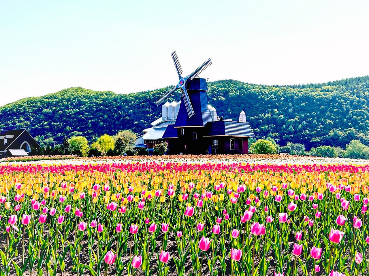 Sur 12,5 hectares, 700 000 tulipes appartenant à 200 variétés s’épanouissent simultanément, offrant un spectacle haut en couleur. Des moulins à vent dressés au milieu des parterres apportent une touche d’inspiration néerlandaise à l’ensemble. La floraison atteint généralement son apogée à partir de la mi-mai.