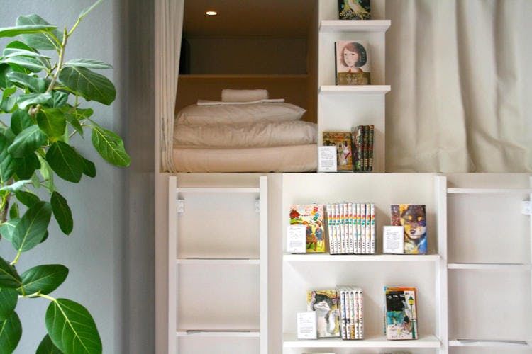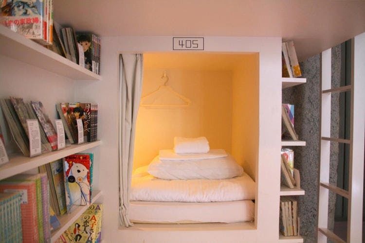 Mais un hôtel, c’est aussi un endroit pour loger et se reposer. Au détour d’un couloir, entre les rayons de mangas, soudain, vous tombez sur une petite chambre de type « capsule », comme une grotte. L’hôtel comporte 35 chambres au total : 19 à l’étage des hommes (au 4e), 16 à l’étage des femmes (au 5e). Certaines sont des chambres à mezzanine, cachées au-dessus des étagères de mangas, accessibles par une échelle.