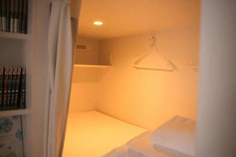 Les capsules, entièrement blanches, comportent uniquement un futon, un coffre-fort individuel, et quelques cintres. La simplicité laisse toute sa priorité à la lecture. Vous choisissez quelques mangas à votre goût, vous vous installez, vous tirez le rideau, vous vous allongez confortablement et vous êtes en immersion complète dans votre espace sacré personnel, rien que vous et vos mangas. Et même si vous êtes grand, vous ne serez pas coincé.