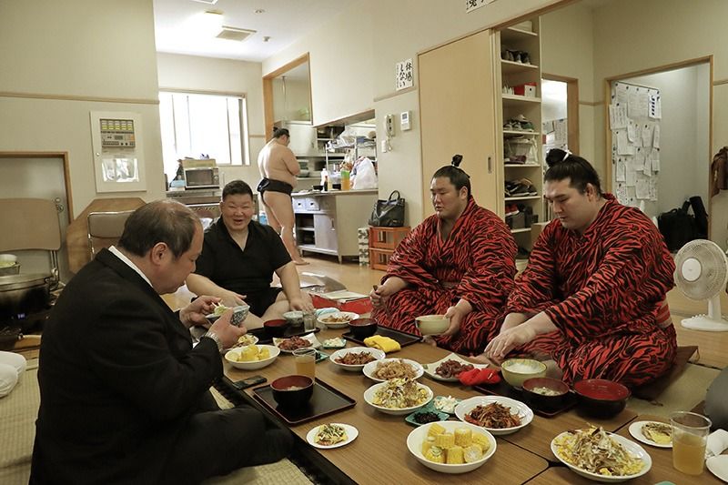 L’entraînement fini, quand les sekitori sortent du bain, le déjeuner est prêt, préparé par les moins gradés qu’eux. C’est le premier repas de la journée pour les lutteurs qui s’entraînent le ventre vide. Le menu est organisé autour du chanko-nabe, la fondue traditionnelle des lutteurs de sumo, ainsi que de nombreux autres plats. Ce jour-là, la fondue aux boulettes de poulet haché est accompagnée de poulet sauté aux oignons, sashimi de thon, galettes okonomiyaki, kinpira (légumes sautés), salade, maïs et pastèque, entre autres.