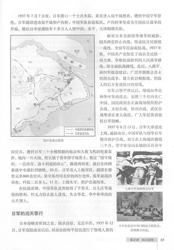 Les manuels chinois publiés par les Presses pédagogiques du peuple ont fait l’objet de changements significatifs en 2002. Les nouveaux textes ont été progressivement distribués dans le pays où ils ont diffusé une version nettement plus nationaliste de l’histoire de la période de la guerre. Jusque-là, les livres d’histoire mettaient surtout l’accent sur la guerre civile entre le parti communiste et les forces nationalistes en insistant sur le fait que les communistes étaient à l’origine du mouvement de résistance contre l’invasion japonaise. Quant au massacre de Nanjing, on ne lui accordait qu’une importance limitée du fait que les nationalistes ont joué un rôle déterminant dans les combats. Les nouveaux manuels donnent une place plus limitée à la guerre civile tout en accentuant le rôle joué par le mouvement d’union nationale contre le Japon. Le massacre de Nanjing y tient par ailleurs une grande place, avec des illustrations décrivant les atrocités commises par les armées impériales.