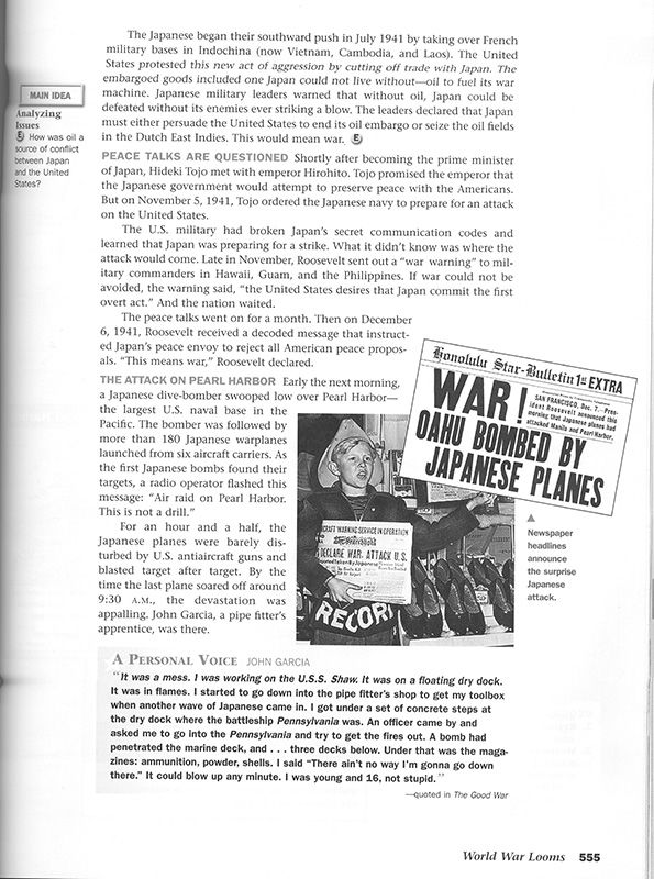Passage d’un livre d’histoire américain sur l’attaque de Pearl Harbour