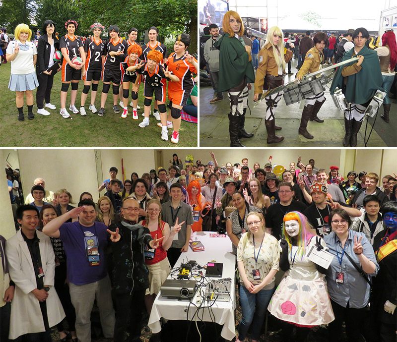 Des événements réunissant les fans d’animation japonaise sont organisés chaque année dans de nombreux pays. Cosplayers Haikyû !! au festival Connichi, qui réunit les fans de manga et animation japonaise à Kassel en Allemagne depuis 2014 (en haut à gauche) ; Cosplayers L’Attaque des Titans (Shingeki no Kyojin) lors de Anime Friends, le plus grand festival d’anime et manga d’Amérique du Sud, à São Paulo au Brésil (en haut à droite) ; Les auditeurs à l’issue d’une conférence au festival Anime North, à Toronto, Canada (en bas). (Photos : Sakurai Takamasa)