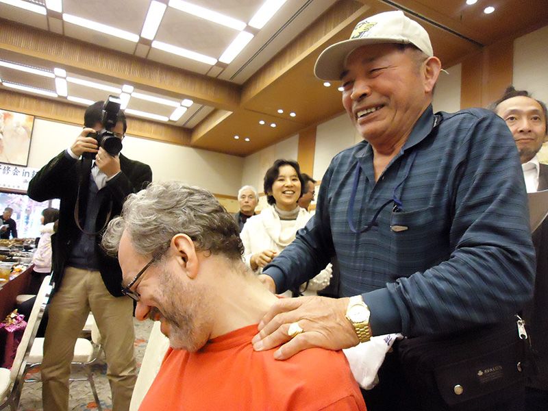 Takahashi Masato masse les épaules de l’auteur lors d’une réunion au hameau de Nagadoro.