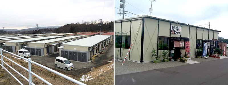 Logements préfabriqués au Centre d’hébergement provisoire N° 1 de Matsukawa (à gauche). Les gens continuent d’y vivre quatre ans après la catastrophe. L’ensemble dispose d’un restaurant proposant des plats de nouilles, géré par un couple originaire d’Iitate, ainsi qu’une petite épicerie (à droite).