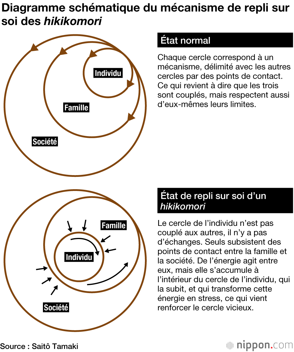 Le harcèlement scolaire par les pairs ou les enseignants est souvent à l’origine d’un isolement chez soi. Selon M. Saitô, il est très rare que le syndrome de stress post-traumatique ou la maltraitance soient impliqués. Lorsque ce repli temporaire dépasse une certaine durée, un mécanisme négatif s’installe, et la personne est prise dans un cercle vicieux (voir le diagramme). À l’état normal, il existe des points de contact entre les individus, les familles et la société, mais lorsque débute le repli sur soi, les hikikomori perdent tout contact avec autrui. Puis, par une sorte de sentiment de « honte », c’est au tour de la famille de perdre à son tour graduellement contact avec la société... Une fois cette grave situation installée dans la durée, comment réaliser un retour dans la société en ne comptant que sur ses propres forces ? C’est extrêmement difficile. Les enfants affectés atteignent l’âge mûr, leurs parents vieillissent, et cela renforce encore leur isolement...