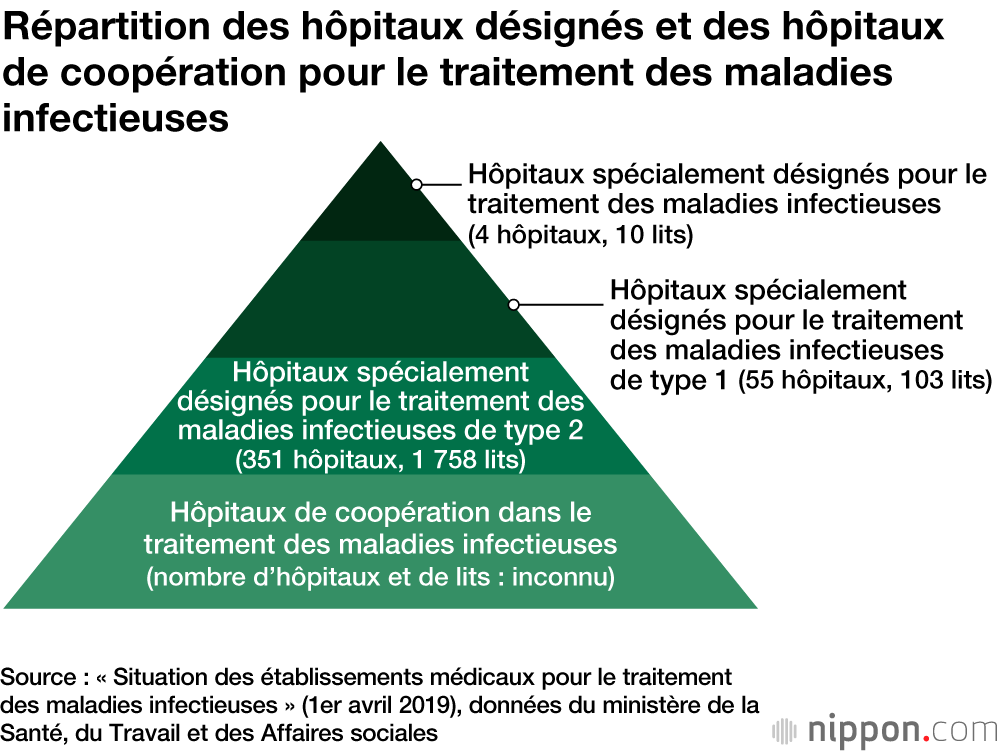 Il existe différents types d’hôpitaux désignés pour le traitement des maladies infectieuses. Schématisé, le classement de ces différents établissements peut être représenté sous la forme d’une pyramide (voir ci-dessous). Au sommet de cette pyramide, les hôpitaux spécialement désignés pour le traitement des maladies infectieuses, viennent ensuite les hôpitaux spécialement désignés pour le traitement des maladies infectieuses de types 1 et 2, et enfin à la base de la pyramide, les divisions hospitalières réservées pour le traitement de la tuberculose.
