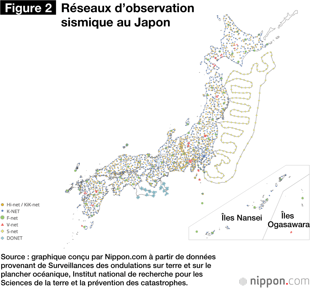 Le tremblement de terre de Kobe de 1995 a donné lieu à un profond remaniement du système en place, consécutif à la prise de conscience de l’urgence qu’il y avait à comprendre l’activité sismique contemporaine et les mouvements de la croûte terrestre. Le cœur du réseau d’observation du Japon s’articule autour de deux dispositifs d’envergure nationale : d’une part le Hi-net, le Réseau japonais de sismographes de haute sensibilité, géré par l’Institut national de recherche pour les Sciences de la terre et la prévention des catastrophes, doté d’environ 800 bases, de concert avec plusieurs autres réseaux (voir figure 2), et, d’autre part, le Système mondial de navigation par satellite SMNS et son système en réseau d’observation de la Terre, ou GEONET, qui dépend de l’Autorité japonaise d’information géospatiale et s’appuie sur environ 1 300 bases.