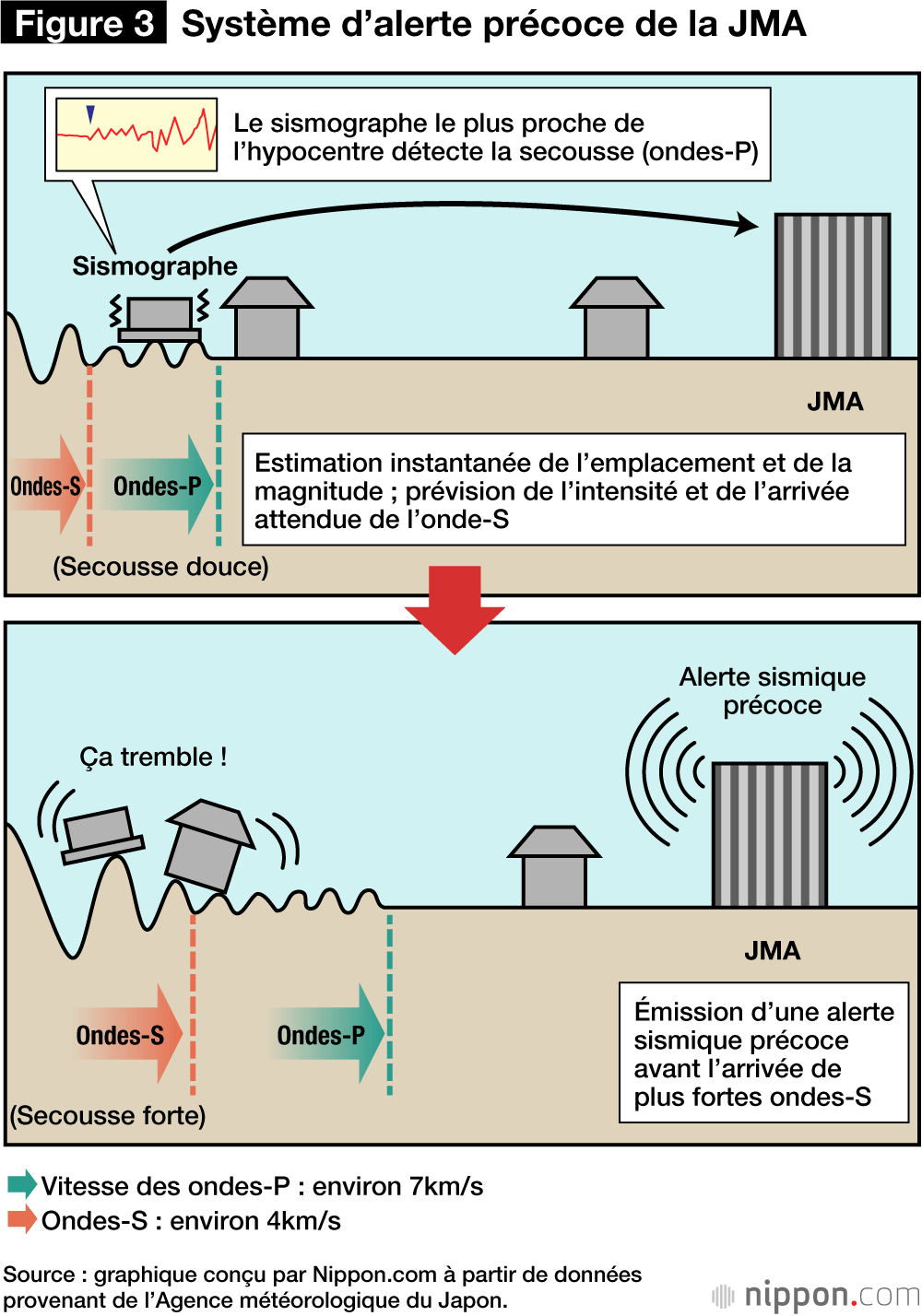 La prévision des séismes ne peut établir qu’une probabilité — il n’existe aucun moyen de savoir avec certitude qu’un séisme va se produire à un moment donné. Mais immédiatement après le début d’un séisme, savoir en quelques secondes s’il va se transformer en une énorme secousse pourrait contribuer à sauver des vies. À l’heure actuelle, on enregistre des progrès dans la recherche sur ce genre d’informations en temps réel ainsi que dans l’application des résultats. L’Agence météorologique du Japon (JMA) a mis en place son service d’alerte précoce en 2007 (voir figure 3).