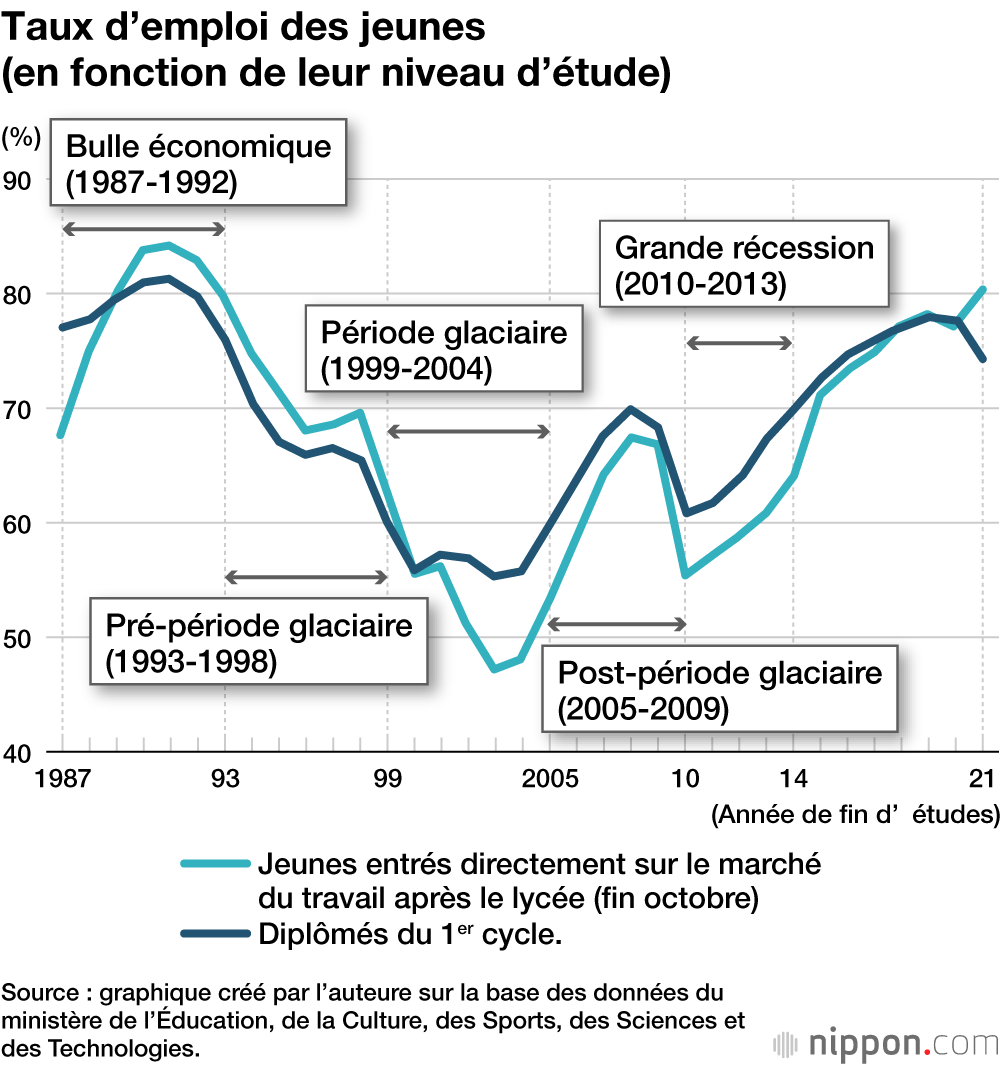 En effet, la marge de manœuvre des entreprises est encore réduite avec la crise financière asiatique de la fin des années 1990, une crise qui a notamment causé en 1997 l’effondrement de la Hokkaidô Takushoku Bank et de Yamaichi Securities. De 1999 au début des années 2000, l’embauche des jeunes est au plus bas (le pire taux sur trente ans). La situation se rétablit doucement après 2005. En 2007-2008, on retrouve le niveau du milieu des années 90 avant une rechute en 2010 suite à la grande récession déclenchée par la crise financière internationale de 2008 (sachant que le séisme, le tsunami et la catastrophe nucléaire de la centrale de Fukushima de mars 2011 ont également impacté l’emploi au Japon).