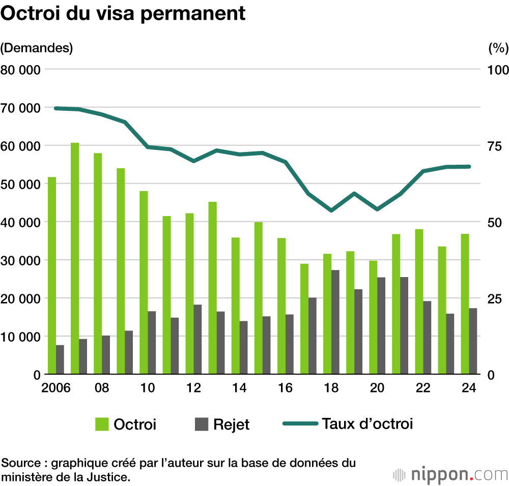Les premières statistiques du gouvernement japonais portant sur les demandes de visa permanent ne remontent qu’à 2006, mais les chiffres indiquent que le nombre de visas accordés chaque année est en baisse tendancielle depuis 2007. Un rebond a été constaté entre 2018 et 2022, mais les chiffres n’ont jamais atteint le pic de 2010 et, ces dernières années, il tourne autour des 35 000 demandes. Le taux d’acceptation reflète par ailleurs cette tendance.